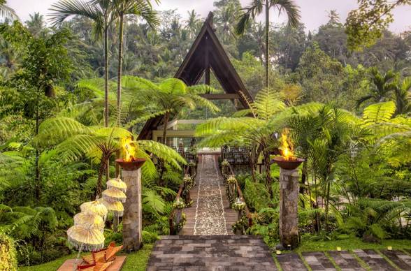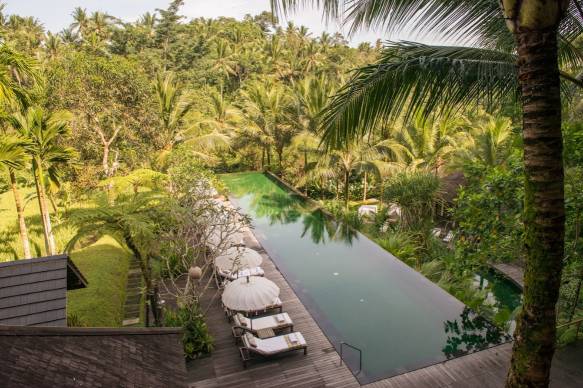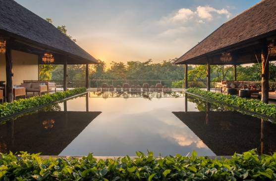 Komaneka at Bisma is a sophisticated and contemporary Balinese resort nestled on a majestic slope overlooking the tranquil Campuhan river valley in the cultural heart of Ubud. It offers breathtaking scenic views of the tropical rainforest, lush coconut groves, and the resort's own sprawling rice fields, providing a true oasis of calm and serenity. The design brilliantly marries bold, expansive modern architecture with traditional Balinese elegance, reflecting the warm, genuine vision of the Balinese couple who founded and run the resort.