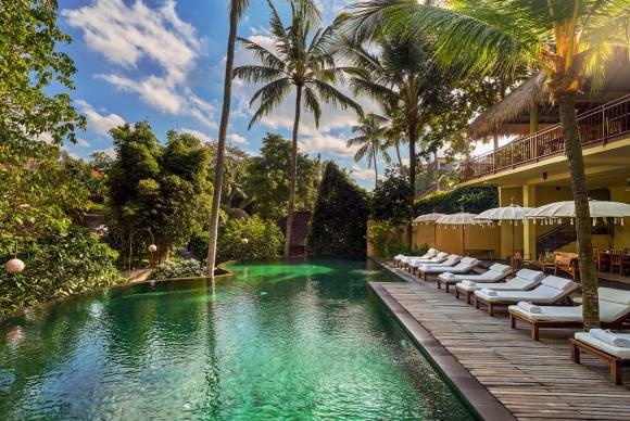 The primary unique selling point are Unbeatable Walkability & Hidden Peace. Offers maximum walkability to the sacred forest, market, and palace, combined with a peaceful infinity pool sanctuary hidden from the street, making it ideal for blending exploration and relaxation. The resort’s infinity pool is a visual highlight. It is tiled with natural green stone (Sukabumi stone) and looks out over a verdant river valley. It creates a stunning "wall of green" effect that makes you feel like you are deep in the jungle, even though you are in the center of town.