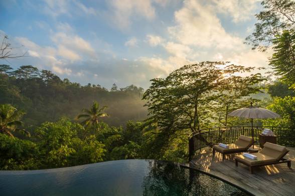 The primary unique selling point is Dramatic High-Ridge Location. Features an incredible central infinity pool that merges with the stunning river valley landscape, setting an atmosphere of profound romantic seclusion and natural grandeur. Offers expansive private pool villas.