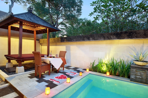 The primary unique selling point of this hotel are private pool guaranteed + multiple free shuttles. The guarantee of a private pool in every villa is matched by the convenience of multiple complimentary shuttle services to Jimbaran, Kuta, and Nusa Dua, balancing seclusion with accessibility.