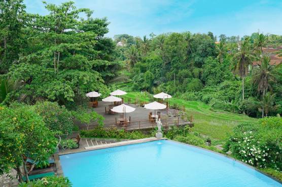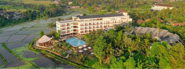 The hotel's unique selling point are secluded hilltop tranquility & view. Its secluded location combined with a spectacular infinity pool and gym views overlooking the rice fields provides a profound sense of natural beauty. Features a unique bamboo pavilion restaurant and complimentary shuttle to Ubud Center.